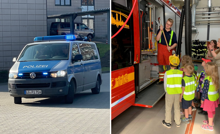 Doch bei dem einen Blaulicht sollte es nicht bleiben. Wir durften auf Initiative eines Elternteils mit einer kleinen Kindergruppe die Lüneburger Feuerwache besichtigen. Hautnah konnten wir die Schutzkleidung der Feuerwehrleute bestaunen, den großen LKW mit der Drehleiter besteigen, um anschließend dann in einem Einsatzfahrzeug platznehmen zu dürfen. Außerdem erhielten wir einen genauen Einblick in die Gerätschaften der Feuerwehr. Ein wirklich unvergesslicher Tag, der bei vielen der Kinder für leuchtende Augen sorgte.