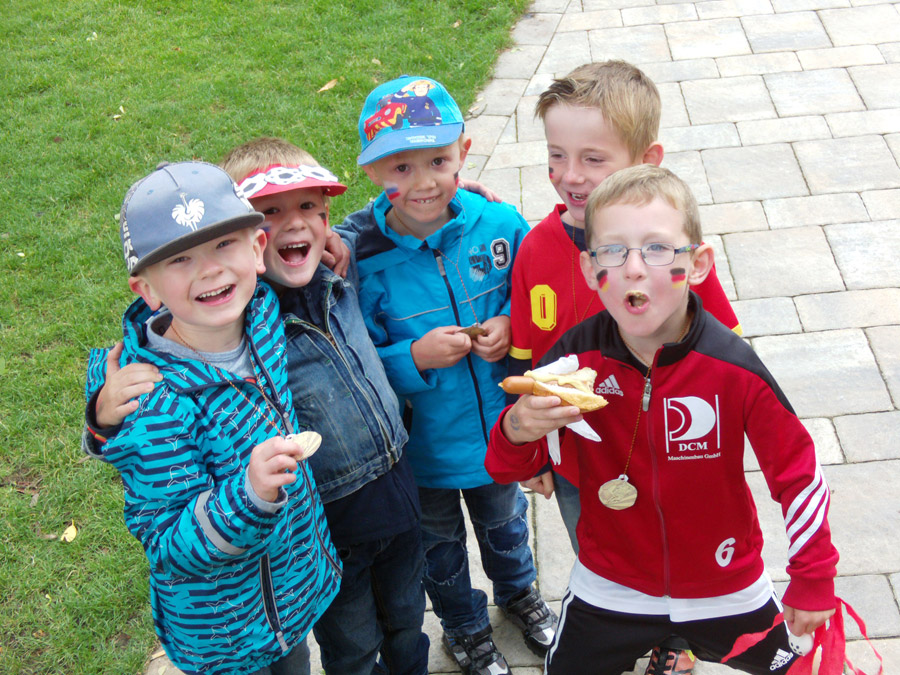 Nach Wunsch wurden verschiedene Länderflaggen geschminkt, Fußball-Schirmmützen und Fußbälle mit Gesichtern konnten gebastelt werden und ein Glücksrad lockte die Gäste mit tollen Gewinnen. Hier gab es allerdings nicht nur Gewinn-Treffer: Die Nachwuchsspieler wurden auch mit Geschicklichkeitsübungen wie z.B. Dribbling um die Beine oder sogar zwischen Hütchen herausgefordert! Beim Tipp-Kick musste der Fußball für den Torschuss zunächst aus einem Swimmingpool gefischt werden. Für die Anzahl der Versuche mit dem Kescher war dabei das Alter der jungen Torschützen entscheidend. Auch gab es eine Torwand, an der fußballbegeisterte Stürmer ihr Glück versuchen konnten. Torchancen hatte man außerdem reichlich beim Werfen der mit Sand gefüllten und bunt bebänderten Luftballons, die die Kinder selbst herstellten. Beim Pustefußball auf kleinen Fußballfeldern konnten mutige Nachwuchstalente gegen MitarbeiterInnen antreten, oder aber auch ihre eigenen Eltern, Großeltern oder Geschwister herausfordern. Dem Gewinner wurde nach dem konditionell anspruchsvollen Match eine Goldmedaille verliehen.