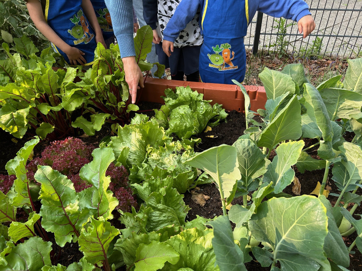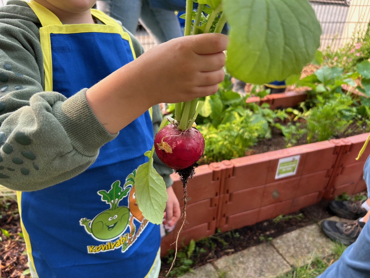 Wir verabredeten uns für einen weiteren Termin, um gemeinsam die ersten Früchte zu ernten. Gesagt getan, 8 Wochen später kam Herr Dia mit einer Mitarbeiter*in ein zweites Mal vorbei, um gemeinsam mit uns den ersten Salat, die Radieschen und Kohlrabi auszubuddeln und zusammenzutragen. Die gute Pflege durch die Kinder hatte sich wirklich ausgezahlt, so dass wir unsere Mahlzeiten fortan durch frisches Gemüse aus dem eigenen Anbau ergänzen können. Wir danken der Edeka Stiftung für die tolle Aktion und freuen uns schon auf das nächste Jahr.