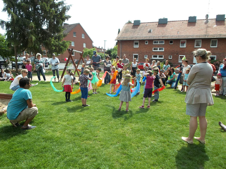 ...so klingt es am Samstag den 06.06.2015 um 14:00 Uhr vom Gelände des Sprachheilkindergarten St. Bonifatius in die Welt hinaus. Mit diesem Lied begrüßen die Kinder, Therapeuten, Erzieherinnen und Erzieher, Praktikantin und die Bereichsleitung Frau Bärbel Schnettker die Eltern und Angehörigen zum jährlich stattfindenden Sommerfest.