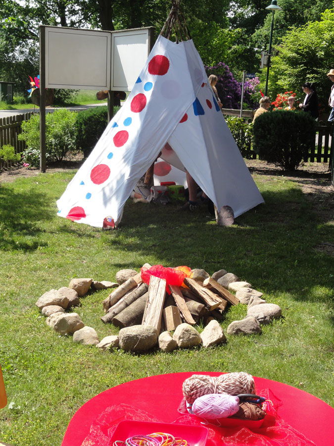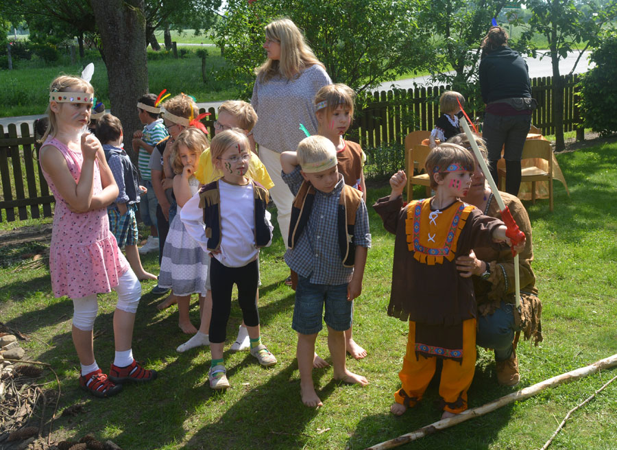 Das Thema des diesjährigen Festes ist so einfach wie effektvoll: Cowboys und Indianer! Wenn die Generation der Eltern vielleicht noch durch Winnetou und Old Shatterhands geprägt wurden, so sorgen Yakari und andere neue Idole für die generationsübergreifende Faszination dieser Figuren. Auf dem ohnehin sehr schönen Gelände wurde ein Indianerdorf errichtet. Ein Tipi lädt mit selbstgebastelten Indianertrommeln, diversen Schafsfellen und indianischer Hintergrundmusik zum Träumen und gemeinsam Musizieren ein. Es können indianischer Kopfschmuck und Traumfänger gebastelt werden und wer sich passend schminken lassen möchte, kann dies hier ebenfalls tun. Um sich darüber hinaus in die Welt der Indianer entführen zu lassen wird man hier eingeladen sein Schuhwerk abzulegen und einen eigens angelegten Barfußpfad zu begehen.